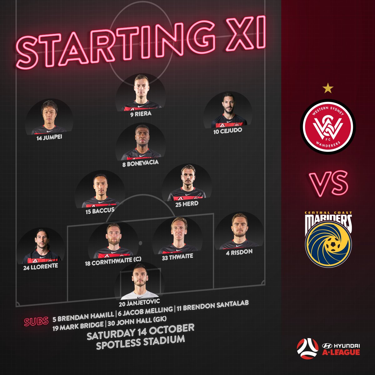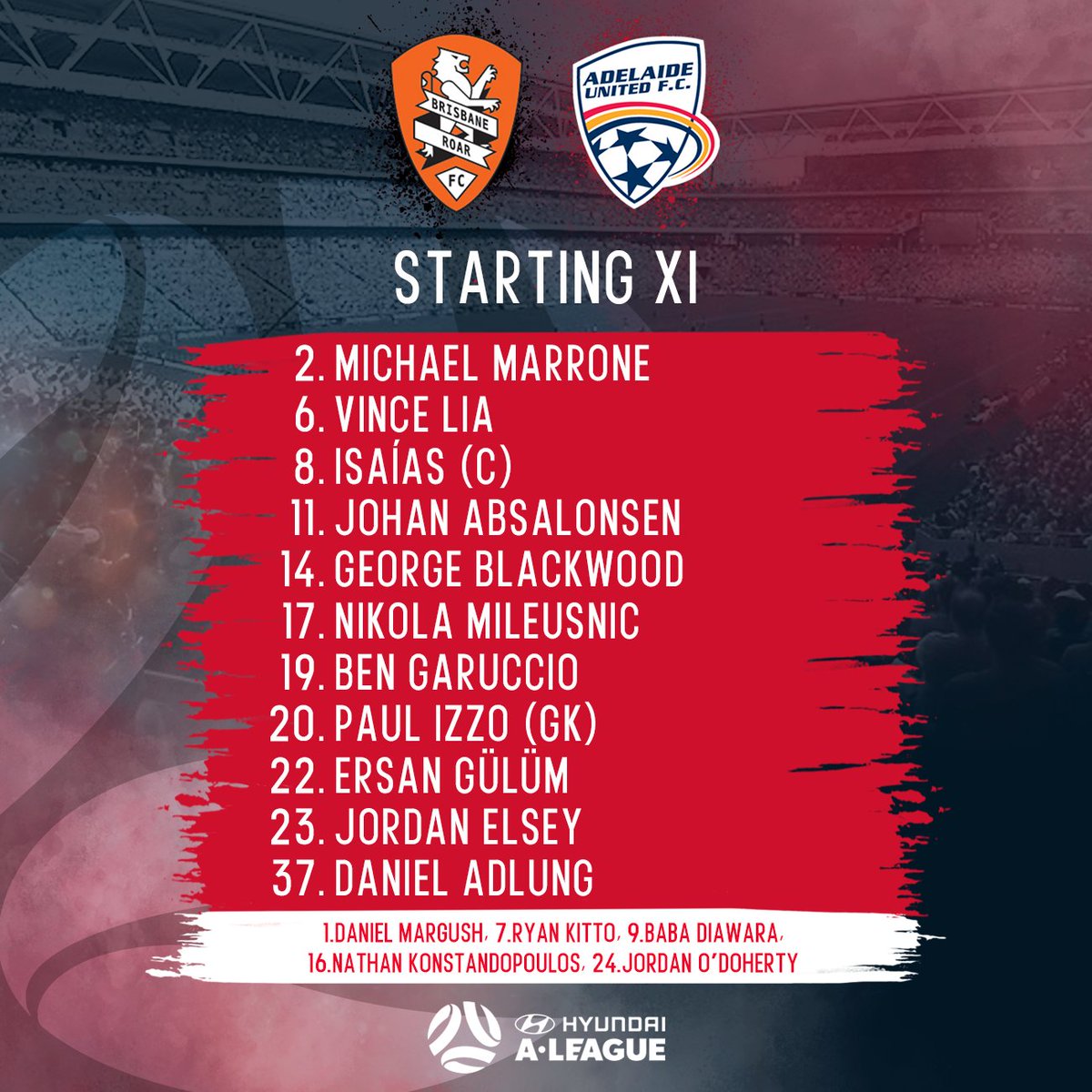 Kosta, Milligan & Troisi back in for the Victory. DJ Brox shifts to left back