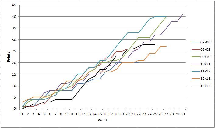 10/11 - DWLLWDLWLDLLWLLWDLWLWDWLW - 32pts - LWWLW - 41 pts (30 games)