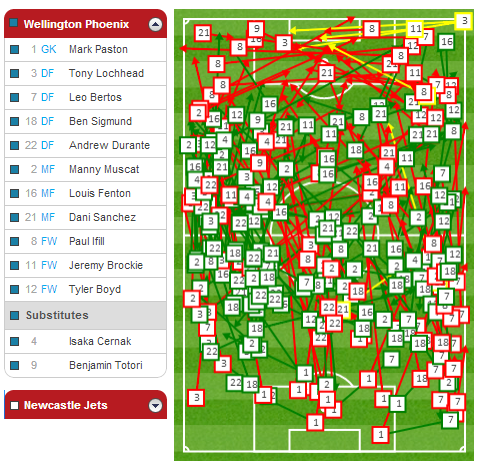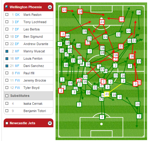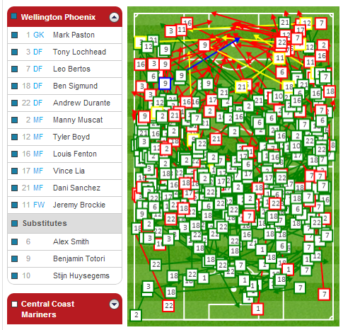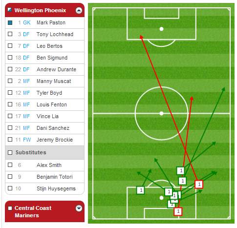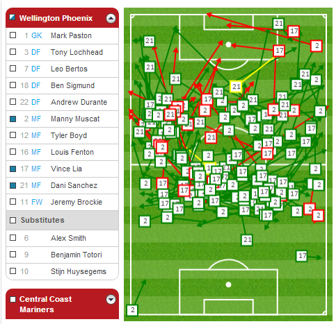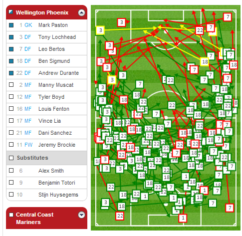 You can see how much possession Vinnie and Manny are receiving from defence in that area around the centre circle. Vinnie was very disciplined in the game against CCM a high concentration of his passes in this area, switching the ball to either flank while Manny's passing was evenly spread around the middle third of the pitch.